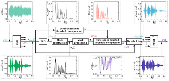 Considering the processing domain, traditional speech-enhancement methods can be divided into three categories, namely time [6,7,8,9,10], frequency [11,12,13,14] and time–frequency [15,16,17,18] domain methods. Despite the significant development of speech-enhancement techniques [19,20,21,22,23,24,25] from particular categories in recent years, there is still a problem of obtaining a high-quality speech signal with high noise attenuation. Typically, if a method maintains high noise attenuation properties, such a method does not always provide a significant improvement in speech quality. On the other hand, many methods with the potential to significantly increase the quality of speech do not allow high attenuation of the noise signal. The abovementioned problem significantly worsens in the case of highly noisy speech signals. Therefore, considering the presented problems, it can be seen that in recent years there has been a growing tendency to solve speech-enhancement problems using machine-learning methods [26,27,28,29], in particular using various deep-learning techniques [30,31,32,33,34]. However, machine-learning approaches, compared to traditional speech-enhancement techniques, often require significant computational capabilities of the hardware on which the approach is implemented, and it is necessary to create a representative dataset that includes possible numerous real-world cases. It is worth noting that despite the creation of a representative training and validation dataset, the over-fitting of the appropriate model can still occur, which cannot be generalized. Therefore, methods of traditional speech enhancement are still being developed, regardless of machine-learning methods. Hence, the paper presents a new traditional method of speech enhancement based on a new high-efficiency decomposition technique for non-stationary noisy signals, i.e., an enhanced empirical wavelet transform [35], which, in combination with the Teager energy operator [36], allows the high suppression of the noise signal (based on the signal-to-noise ratio (SNR) [37]) and allows for a significant improvement in the quality of speech (based on the perceptual evaluation of speech quality (PESQ) measure [38]), especially in the case of a highly noisy signal of speech. The proposed approach does not require an explicit estimation of the noise level or a priori knowledge of the signal-to-noise ratio, as is usually needed in most common speech-enhancement methods. The presented approach was verified and compared with other available approaches in the literature. Verifications of the proposed approach in the paper were carried out on recordings from one microphone. It is worth noting that the proposed approach has the possibility of multidimensional analysis, and thus, it is possible to apply/extend the proposed approach to the analysis of speech signals from many microphones.