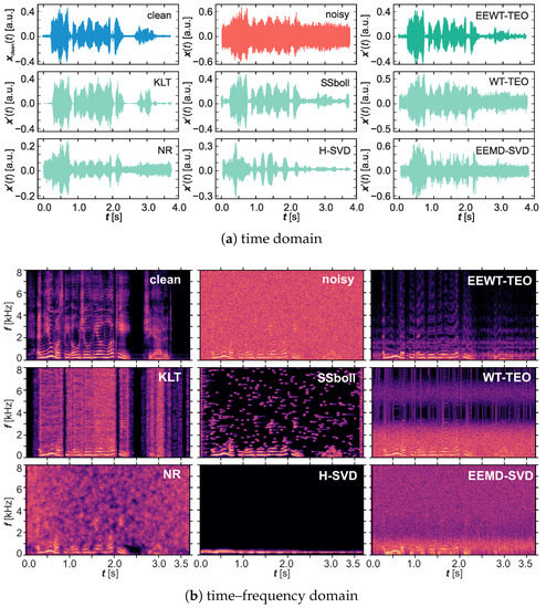The comparison of the effectiveness of the considered methods for the selected speech signal with the “white” noise with the value of in the time (a) and the time–frequency (b) domain.