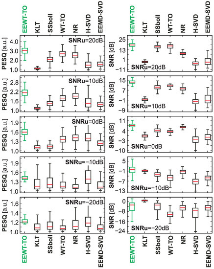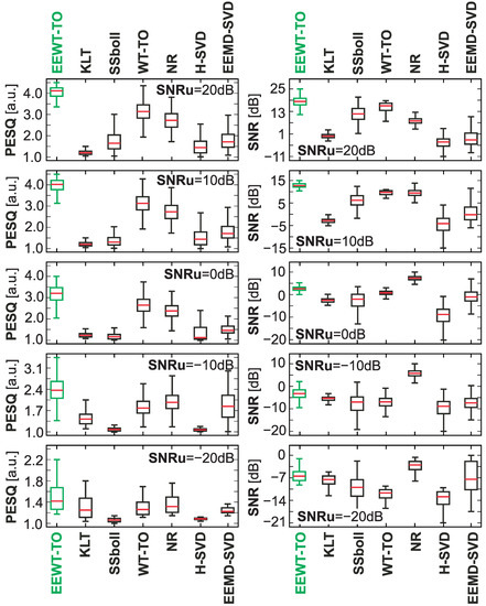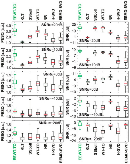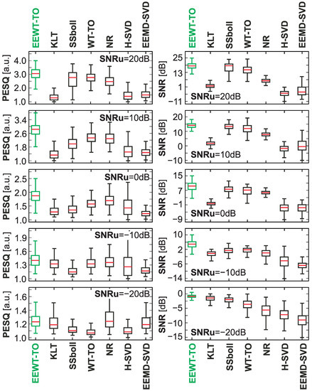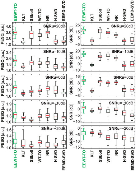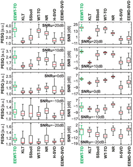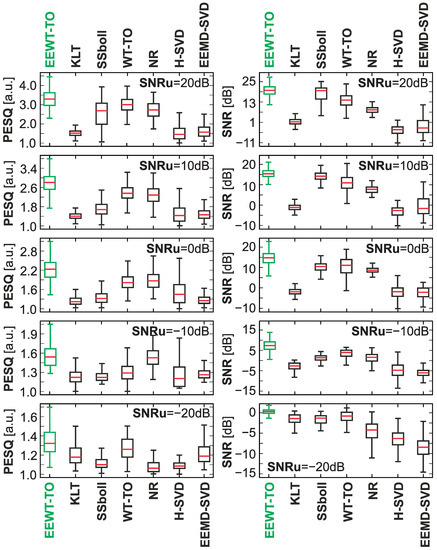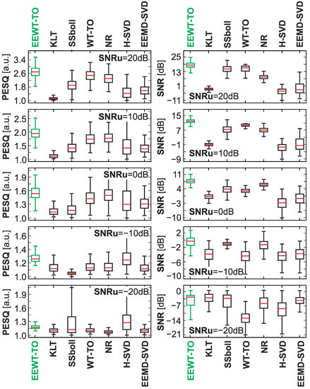For individual considered noisy speech signals, the process of speech enhancement was implemented using the proposed approach and selected methods of noise reduction or speech enhancement available in the literature, i.e., Karhunen–Loeve transform (KLT)—a generalized subspace approach of KLT [44,45], SSboll—spectral subtraction [13,46], WT-TEO—wavelet speech enhancement based on time-scale adaptation [47], NR—noise reduction using spectral gating [48,49], H-SVD—noise-reduction technique based on Hankel matrix and singular value decomposition [50], EEMD-SVD—noise-reduction technique based on ensemble empirical mode decomposition and singular value decomposition [51].
