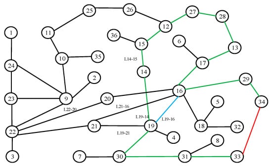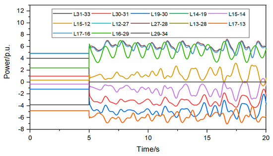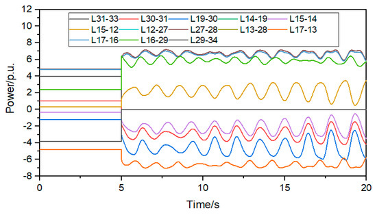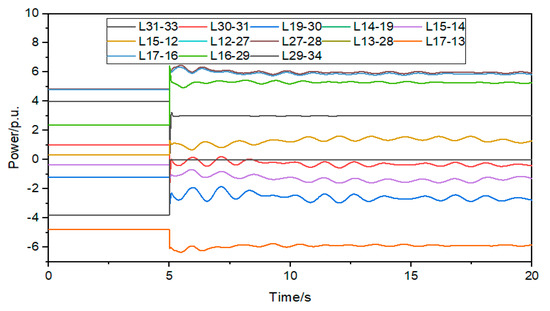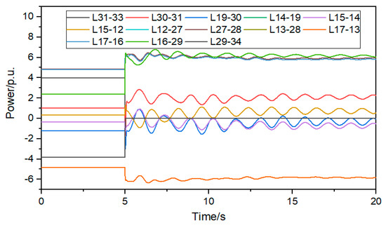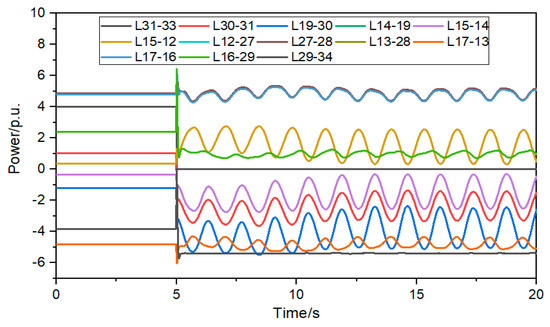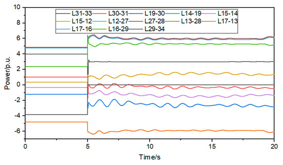 The simplified structure of the power grid is shown in Figure 3. The red line represents the DC bipolar locking fault line. The blue line and black line represent the non-shortest path AC line. The green line represents the shortest path AC line. The converter station of node 33 has a DC bipolar locking fault, and the Dijkstra algorithm is used to obtain the shortest path composed of node 33 and node 34, namely: 33, 31, 30, 19, 14, 15, 12, 27, 28, 13, 17, 16, 29, and 34, a total of 13 AC lines. The power change curve of the AC line is shown in Figure 4 and Figure 5 after the converter station of node 33 has a dual-machine locking fault at 5 s.