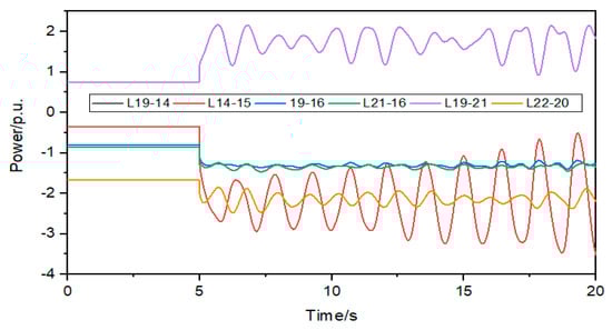 It can be seen from Figure 4 that the power variation of lines L19-14 and L14-15 is the largest, with a power variation greater than 2 p.u., and the power variation of other lines is less than 1.3 p.u. It can be seen from Figure 5 that the power variation of the AC line on the shortest path is greater than 1.5 p.u. It can be seen that after the DC bipolar locking fault, the power flow is mainly in the shortest path composed of node 33 and node 34.