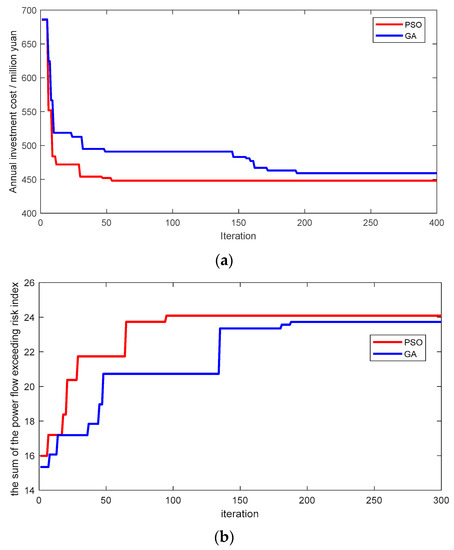 The iterative convergence curve. (a) Iterative convergence curve of energy storage annual investment cost. (b) Iterative convergence curve of the sum of improved power flow exceeding the risk index.