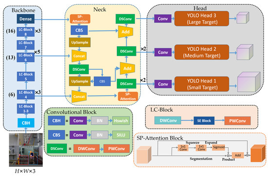As shown in Figure 1, the SP-YOLO-Lite network consists of three parts: Backbone, Neck, and Head. The Backbone is primarily composed of multiple Lightweight Convolutional Blocks (LC-Blocks) [21], which extract features of different scales from the input image through a series of convolution operations. The Neck is built upon the PANet and incorporates the Depthwise Separable Convolution (DSConv) [22] and Segmentation-and-Product (SP) attention module, enabling the aggregation and fusion of features from various layers of the Backbone. The Head consists of multiple detection heads composed of convolutional layers, pooling layers, and fully connected layers. Each detection head receives feature maps of different scales from the Neck network and finally outputs the position, category, and confidence of different scale targets.