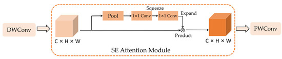 In this paper, we propose a lightweight Backbone network based on LC-Block. LC-Block is a lightweight convolutional module that exhibits smaller parameter and computational requirements, as well as higher efficiency in feature extraction compared to conventional convolutional modules commonly used in general-purpose object detection algorithms. The specific structure of the LC-Block is illustrated in Figure 2. It is composed of Depthwise Convolution (DWConv), Pointwise Convolution (PWConv), and a Squeeze-and-Excitation (SE) attention module. DWConv is a lightweight convolutional module that performs convolution operations only on one channel of the input tensor for each convolution kernel. PWConv is a conventional convolution module with a kernel size of 1 × 1, which is often used in combination with DWConv to linearly combine the feature maps of each channel and obtain more complex feature representations. The SE attention module is inserted between the PWConv and DWConv to enhance the model’s ability to extract effective features from the images. The specific structure of the SE attention module used in this paper is shown in Figure 2. The output feature map of size C × H × W from DWConv will be fed into the SE module for the following attention operations. Firstly, the feature map is compressed to a 1 × 1 × feature vector by pooling operation. Then, two 1 × 1 convolution modules are used to compress and expand channels, respectively, to generate channel attention score vectors. Finally, the vector will be weighted on each channel of the input feature map to generate a weighted feature map of size C × H × W.
