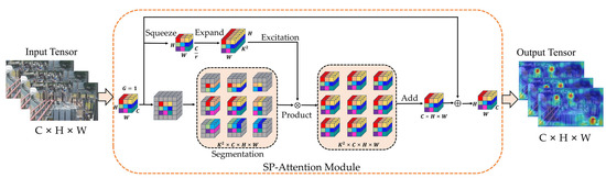 The SP Attention Mechanism first segments the input feature map into several feature maps with different spatial locations and then assigns different weights to each feature map to filter out important target features in different spatial positions. Taking Figure 3 as an example, the SP attention module takes an input image of size . The hyperparameters in the figure are set as follows: = 3, = 3, = 3, = 2, and = 1. Here, represents the size of the sliding window used to segment the feature map, is the compression factor of the input feature map channel, and is the number of groups to which the input feature map is sliced in the channel dimension. The mechanism performs the same attention operation on each group. The specific implementation steps of the attention mechanism are as follows: