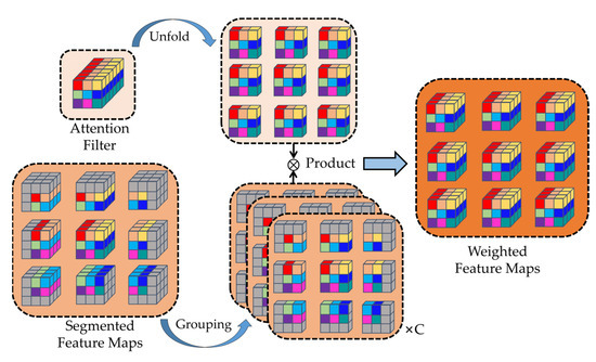 - Product: The output of the top branch (the attention filter) and the bottom branch (the segmented feature maps) is multiplied element-wise using a product operation. As shown in Figure 4, the product operation between the attention filter and the segmented feature maps can be equivalently expressed as follows: Firstly, the attention filter is sequentially unfolded along the channel dimension and the segmented feature maps are divided into groups according to the channel order. Then, the attention filter is multiplied with each group of the segmented feature maps element-wise, that is, the elements at the same position are multiplied. Finally, the weighted feature maps are output. The product operation realizes the filtering of the attention filter on the feature maps representing different regions.
