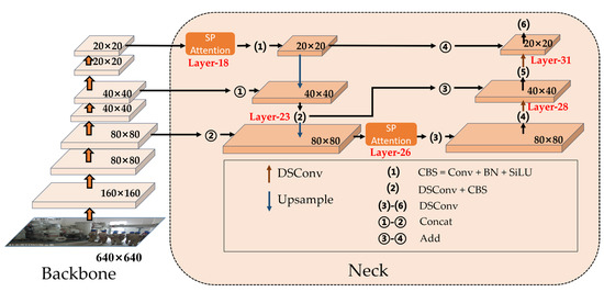 When constructing the Neck network, we first inserted SP attention modules at a connection between the Backbone and Neck (at the 18th layer), as well as within the Neck network (at the 26th layer), to enhance the model’s ability to extract features from deep low-resolution features and shallow high-resolution features with relatively low computational cost. Next, we pruned the channel numbers in the Neck network’s layers, while maintaining equal input and output channel numbers for the convolution modules at the 23rd, 28th, and 31st layers. This was performed to minimize the memory access cost of the network.