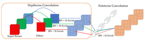 Finally, we lightened the Neck network by replacing the complex CSP module and the conventional convolution used as the upsampling operator with Depthwise Separable Convolution (DSConv). The specific structure of the DSConv used in this paper is shown in Figure 6, which consists of a Depthwise Convolution (DWConv) and a Pointwise Convolution (PWConv) [26]. Additionally, the Batch Normalization (BN) layer and Hard-Swish (H-Swish) activation function are connected after both convolutions to accelerate model training convergence and improve the model’s expression ability [27]. In DWConv, each convolution filter only convolves with one channel of the input tensor, while in a conventional convolution, the filter needs to convolve with every channel of the input tensor. Therefore, compared with conventional convolution, DWConv significantly reduces computation and parameter costs. However, since DWConv independently convolves each channel of the input tensor, it cannot effectively extract the relationship information among different input channels. Therefore, after DWConv, PWConv is required to facilitate inter-channel feature communication and compensate for the feature richness sacrificed by DWConv due to its lightweight design.