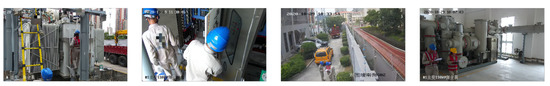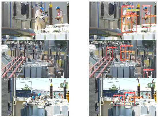 As there is currently no publicly available dataset suitable for detecting violations of power grid workers, we require the construction of a dataset for training the model. In the process of constructing the dataset, we conducted a great deal of work, including image acquisition, image cleaning and annotation, and image normalization. We first collected 6550 pictures of power grid work sites from a certain power company, which were divided into two categories. The first category is high-resolution pictures taken by on-site inspection personnel with cameras, consisting of 5250 images with a resolution of 5184 × 3888 pixels, usually taken from horizontal or oblique angles relative to the target object. The second category is single-frame images captured from the power grid monitoring video, consisting of 1300 images with relatively small resolutions of 1280 × 720 pixels or 1920 × 1080 pixels, usually taken from an overhead angle relative to the target object. Afterward, we cleaned and annotated the collected images to obtain the Security Monitor for Power Construction dataset suitable for this study, which contains 1499 images and 7 categories, including Hat, Human, No-neckline, No-cuff, Safety belt, Seine, and Fence. A sample of the dataset is shown in Figure 8. The algorithm trained on the SMPC dataset is designed to detect violations in the attire and behaviors of workers. Specifically, it can detect whether a safety helmet is properly worn, whether the safety clothing is correctly worn (e.g., cuff and neckline), and determine if a worker has violated restricted areas by detecting their relative position to the Seine and Fence.