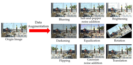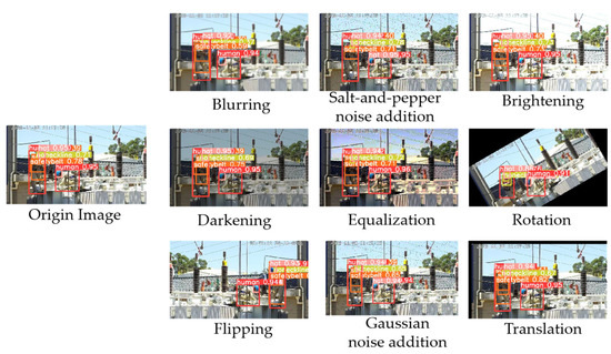 In order to enhance the robustness and generalization of the trained algorithm and improve its performance in the presence of noise, environmental changes, and other abnormal circumstances, while avoiding overfitting during training, we employed data augmentation methods on the SMPC dataset. We applied various data augmentation operations such as Blurring, Salt-and-pepper noise addition, Brightening, Darkening, Equalization, Rotation, Flipping, Gaussian noise addition, and Translation, as illustrated in Figure 9. Through these data augmentation operations, we can simulate various abnormal conditions that may occur in real-world scenarios, including changes in brightness, viewpoint, and noise interference. Additionally, these approaches greatly increase the number of samples in the SMPC dataset, allowing the model to learn a more diverse range of real-world scenario information during training, and making the detection system deployed with this algorithm can operate continuously and efficiently. After data augmentation, the final dataset contained 10,693 images, including 7802 training images, 873 validation images, and 2018 testing images.