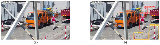 Figure 11 shows the recognition results of SP-YOLO-Lite on four randomly selected images in the SMPC dataset. Figure 11b not only includes detection boxes for different targets but also contains information on the category and confidence of each detection box, where confidence indicates the predicted probability that the target belongs to that category. By comparing Figure 11a with Figure 11b, it can be observed that SP-YOLO-Lite accurately identifies targets such as a hat, human, and safety belt without missing any detection or causing false alarms. Moreover, SP-YOLO-Lite can accurately recognize small targets such as a safety belt with partial occlusion and has high confidence, which further demonstrates the superiority of the SP-YOLO-Lite algorithm.