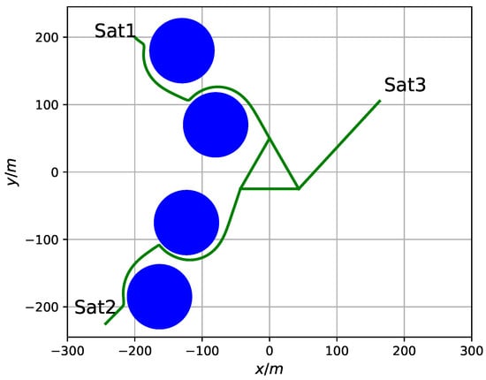 In order to verify the obstacle avoidance ability of the control algorithm, the following numerical simulation is designed. For three slave satellites with initial position deviation, a master–slave control strategy is adopted to realize configuration initialization and the configuration maintenance of an equilateral triangle. Among them, the appropriate position is selected, and two obstacles are set between the initial and desired positions of the two slave satellites. The initialization of the simulation is shown in the Table 1. The simulation verifies whether the two slave satellites can successfully avoid the obstacles at a safe distance during the configuration initialization process.