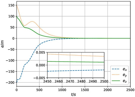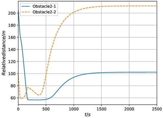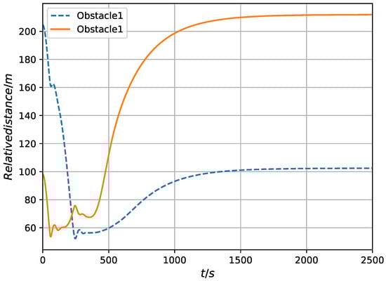Figure 3 and Figure 4 represent the relative distance between the spacecraft and each obstacle. When the spacecraft approaches the obstacle at nearly , the distance expands rapidly, keeps away from the obstacle or close to the edge of the danger area of the obstacle, and approaches the expected position. The distance in the whole process is greater than , indicating that the spacecraft avoids the collision danger area of the obstacle. It can be understood that there is no collision between the spacecraft and the two obstacles.