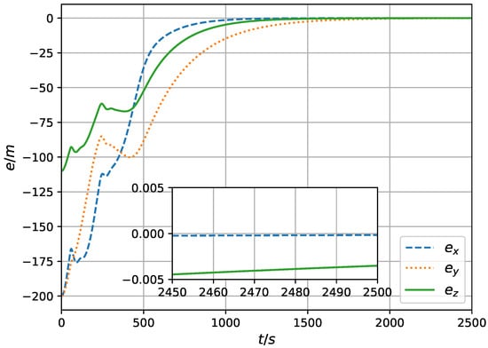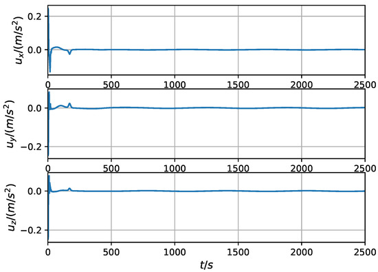 Taking Sat1 as an example, it can be seen that the spacecraft reaches the desired state after avoiding obstacles to achieve the purpose of final control. It can be seen from Figure 5 that the obstacle avoidance time is about 1000 s. Then, the steady-state error of configuration maintenance is within 0.005 m. It can be seen from Figure 6 that the controller output increases when the spacecraft is close to the obstacle.