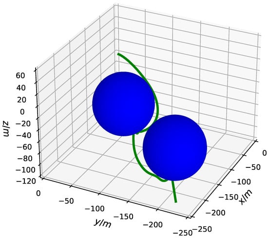 The simulation results using the second order sliding mode terminal controller are shown as follows. Figure 1 and Figure 2 show the three-dimensional motion trajectory of the spacecraft relative to the obstacle from two perspectives, respectively. The blue shadow sphere in the figure indicates the spatial influence range of the obstacle, and the radius of each sphere is set at . The spacecraft approaches from the starting point to the end point and finally reaches the desired position to form a configuration and maintain it.