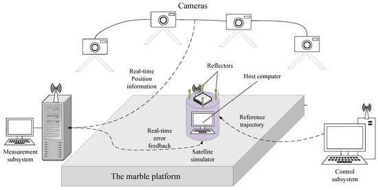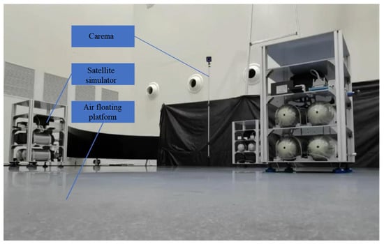 The simulation environment of the satellite simulator mainly includes the satellite simulator subsystem, measurement subsystem, control subsystem, and marble air floating platform. The overall schematic of the semi-physical simulation environment is shown in Figure 11, and the real scene is shown in Figure 12.