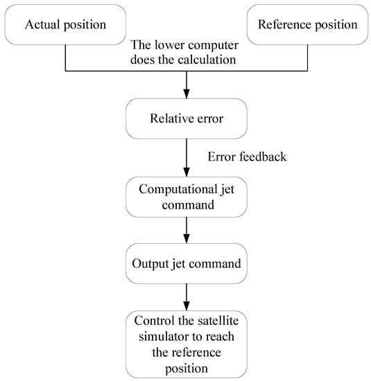 The control subsystem uses the control law to calculate the reference trajectory and transmits the desired trajectory to the satellite simulator through the Wifi signal. The lower computer of the satellite simulator controls the jet nozzle through the internal feedback loop to air injection so that the satellite simulator can track the reference trajectory in real time, to complete the control goal. The control flow of the satellite simulator is shown in Figure 13.