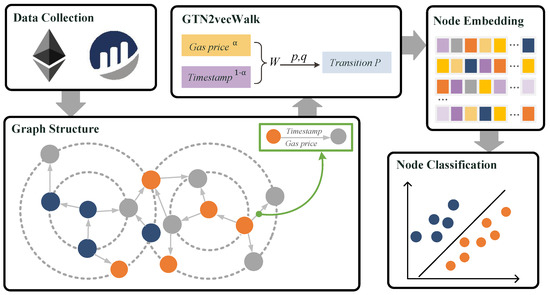 As shown in Figure 1, the overall framework we use to detect money laundering is divided into three parts. First, we obtain the Ethereum real data to construct the graph dataset as an input to the graph embedding. In the graph, we denote addresses with money laundering markers in orange and normal addresses in blue. Using these addresses as source points, we obtain records of transactions between them and their adjacent second-order neighbors. Each edge contains the gas price and timestamp of that transaction, ultimately constructing a directed weighted graph. In the second part, we design a GTN2vec biased random walk strategy that can proportionally fuse the gas price and timestamp of the transaction edges into new weights and generate the transition probability of the walk in conjunction with the structure of the graph. Based on the transition probability, the algorithm obtains embedding vectors that represent the characteristics of each node. Ultimately we use the embedding vectors of the nodes for the classification task to identify the money laundering accounts. The details of our dataset construction approach and the rationale for the GTN2vec algorithm are described next.