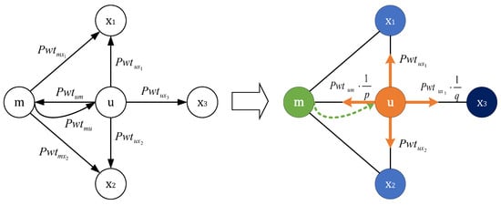 We define three parameters in the algorithm, the return parameter p, the exploration parameter q, and the balance parameter . In a random walk, the size of parameter p determines whether to return to the previous node in the next step. The parameter q determines whether the neighborhood sampling is closer to BFS or DFS. If , then the random walk favors BFS and biases the selection of the surrounding nodes. If , the random walk tends to be DFS, preferring to visit distant nodes. The parameter balances the gas price and timestamp weight in the transition probability, respectively. With these three parameters, we comprehensively consider the key factors that may affect the embedding of money laundering nodes. Specifically, as shown in Figure 2, in a random walk, suppose the current node is u, which has just been transferred from node m and now needs to decide the next step. We denote as the set of all neighboring nodes that can be reached directly from node u. The transition probability from node u to its neighboring node is given by