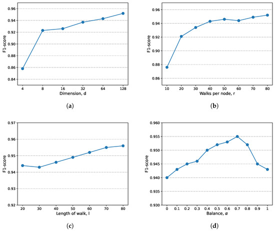 Effect of each parameter of GTN2vec on classification results (author’s own processing). (a) Dimension, d. (b) Walks per node, r. (c) Length of walk, l. (d) Balance, .