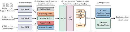 Entity-GCN [24] extracts all the text spans matching the candidates as nodes and obtains their representations from the contextualized ELMo [25] word embeddings, then passes them to the GCN module for reasoning. Based on Entity-GCN, Bi-directional Attention Entity Graph Convolutional Network (BAG) [26] added Glove word embeddings and two manual features, named-entity recognition and part-of-speech tags, to reflect the semantic properties of tokens. On account of the full usage of the question contextual information, it applies the bi-directional attention mechanism, both node2query and query2node, to obtain query-aware node representations in the reasoning graph for better predictions. Path-based GCN [27] introduces more related entities in the graph than the nodes merely matching the candidates to enhance the performance of the model. The Heterogeneous Document-Entity (HDE) model [28] introduces the heterogeneous nodes into GCNs, which contain different granularity levels of information. Additionally, the Keywords-Aware Dynamic Graph Neural Network (KA-DGN) [29] was proposed and designed as a dynamic graph neural network to further tackle reading over multiple scattered text snippets. Furthermore, Zhan et al. [30] and Song et al. [31] separately proposed knowledge-aware and evidence-aware GNN reading models, which integrate dependency relations or multiple pieces of evidence from multiple paragraphs.
