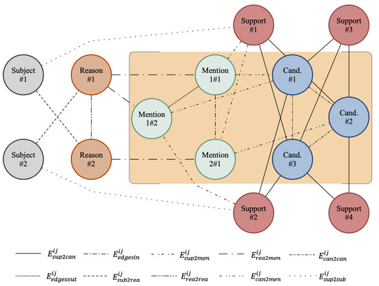- Support Nodes—As described by [5], we consider that multi-type representations may contribute to the reading process, and thus the support documents containing the above nodes are introduced to as support nodes, which are notated as and colored in red in Figure 2.