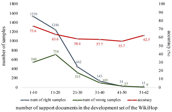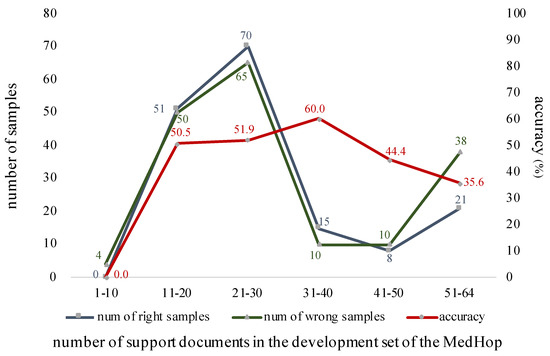 To analyze the scalability of our model, we divided the development set into six groups according to the number of support documents and then determined the accuracy in each group. The grouped accuracies on WikiHop are shown in Figure 4. ClueReader achieved competitive results: 73.59% and 63.57% in the groups of (1–10) and (11–20), with a total of 4039 samples accounting for 95% of the development set. The lowest accuracy of 55.74% was for the group (41–50). However, it increased to 62.5% in the group (51–62), which shows the scalability of our model is effective. The grouped accuracies on MedHop are shown in Figure 5, and they are quite competitive. The highest and second-highest accuracies of 60.00% and 51.85% are in (31–40) and (21–30) groups, respectively, and the lowest and second-lowest accuracies of 0% and 35.59% are in (1–10) and (51–62) groups, respectively. In particular, the result in the (51–64) group on MedHop is against the group (51–62) on WikiHop, which implies that we must concentrate on the difference between the open-domain and molecular textual contexts. The results in the different number of support documents show the contribution of our model to the scalability of the multi-hop MRC tasks.