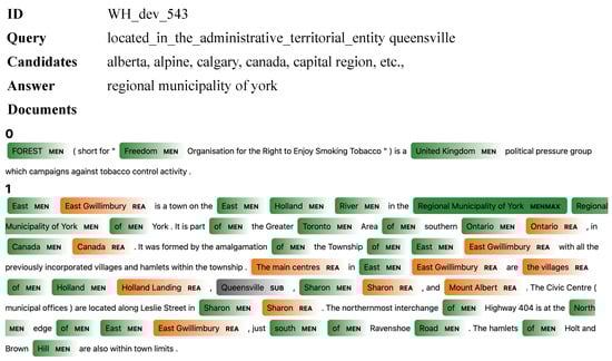 To better understand the model predictions and contribute to further study, we generate HTML files of samples as shown in Figure 8 and analyze whether the named entities contained in the max-score nodes can make sense from the perspective of human answering after reading. Please refer to our project website (https://github.com/cluereader/cluereader.github.io (accessed on 21 June 2023)) for more visualization samples in HTML files.
