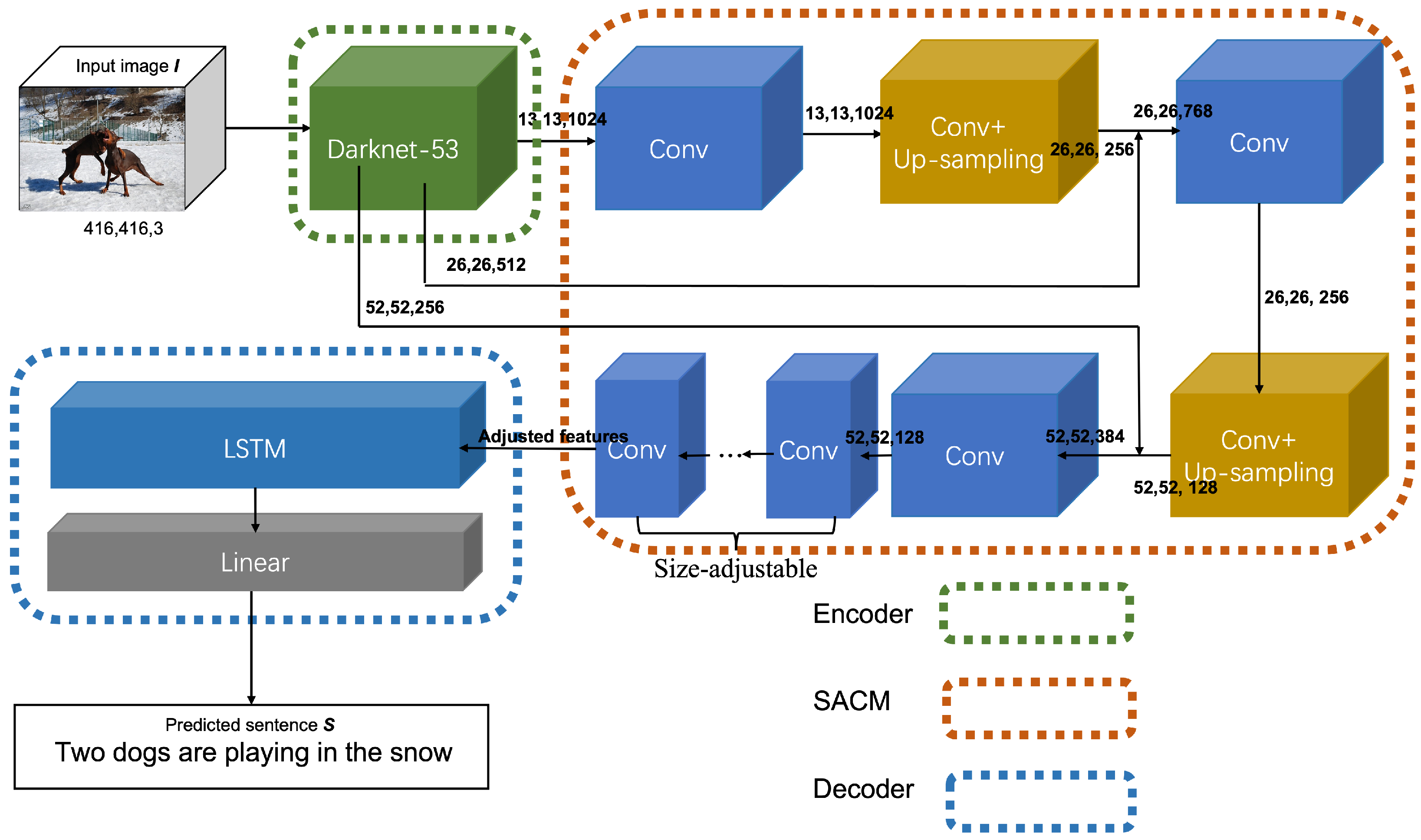 The end-to-end neural network system proposed in this paper, Darknet-SACM-LSTM, is trained to maximize the likelihood of the correct words in the final sentence describing the given image. After training, our proposed systems can automatically generate a descriptive caption in plain English for a given image. Experiments on the Flickr 8K and MS COCO datasets show the robustness of our Darknet-SACM-LSTM system in terms of speed and several metrics of BLEU scores, METEOR, ROUGE, and CIDEr. By using one or more convolutional layers, SACM could reduce the number of features, speed up the predicting process, and maintain the performance of sentence quality measured by using both the cross-entropy loss and BLEU score.