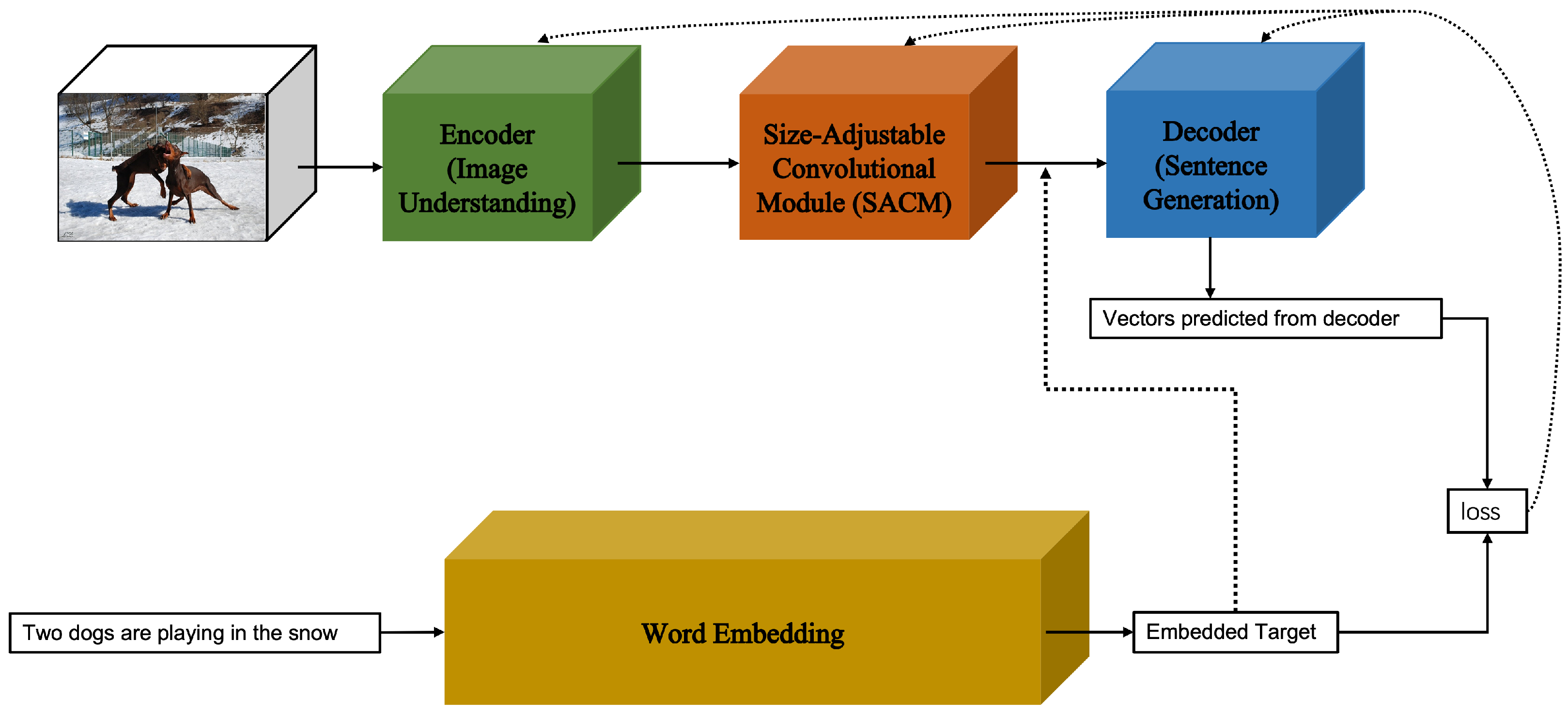 After processing by the first five convolutional layers, the size of the feature maps becomes . The following adjustable convolutional layers can reduce feature dimension directly for sending to LSTM for caption generation. The SACM performs as a pipeline connecting the encoder and decoder to reduce feature dimensions, saving time and computational costs. After passing through SACM, the dimension-reduced feature maps go through to LSTM for generating captions of the provided images.