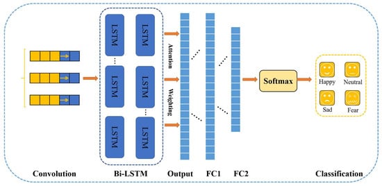 There has been a lot of research into the use of deep learning to process EEG signals for emotional recognition. However, there are still some outstanding issues to be resolved. For example, RNN makes it difficult for networks to learn long sequences due to the presence of multiple recursive layers, gradient explosion, or disappearance. Many studies based on deep learning consider only one characteristic of frequency, such as [34,35,36,37]. In addition, the electrode channels used in related research are mostly not uniform, which directly affects the accuracy and practical application of classification. In order to solve these problems, we propose a CNN-Bi-LSTM emotional recognition model with attention mechanisms based on EEG in this paper. In our model, the EEG data are first extracted through convolution, then Bi-LSTM, and, finally, an attention mechanism layer to automatically capture the most important features of the entire EEG record. Note that the mechanism layer can set the weight coefficients of each channel to distinguish the differences between them. This kind of weighted operation can lead to better use of important information and improve the performance of model recognition.