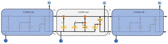 The LSTM model is shown in Figure 3. In the LSTM model, the first step is to decide what information to discard from the “cell”, which is performed using a forgotten gate. The layer reads the current input x and the foreneuron information h, and the ft decides to discard the information. Output 1 means “fully retained” and 0 means “completely abandoned”. The second step, which consists of two layers, is to determine the new information stored in the cell’s state. The sigmoid layer acts as the “input gate”, determining the value i to update. Tanh layer is used to create a new candidate value vector C ˜ t to join the state. The third step is to update the state of the old cells by updating Ct−1 to Ct. We multiply the old state with ft, discarding the information that is not needed. Then, it × C ˜ is added. These are the new candidate values, which vary according to the degree to which we decide to update each state. The final step is to determine the output, which is based on cell state, but also a filtered version. First, we run a sigmoid layer to determine which parts of the cell state will be exported. Then, we process the state of the cell through tanh (to obtain a value between −1 and 1) and multiply it with the output of the sigmoid gate, and in the end, we only export the portion of the output. The mathematical expression of the LSTM unit is defined as shown in Equations (1)–(6).