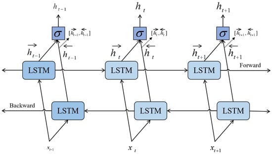 But, both traditional RNN and LSTM messages are sent from the back of the conveyor belt, which has limitations in many tasks, such as lexical tagging, in which a word is related not only to the first word but also to the second. To solve this problem, two LSTM networks are used in this paper, which are also known as bi-directional long- and short-term memory networks (Bi-LSTMs), which are forward and directional. The Bi-LSTM neural network structure model is divided into two independent LSTMs, and the input sequence is represented by two LSTM neural networks (one positive order and one negative order). So, the arrows of ht represent the LSTM in both the anterior and posterior directions. The Bi-LSTM network structure is shown in Figure 4.