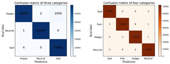 As shown in Figure 5, we drew the confusion matrices of the CNN-Bi-LSTM-Attention model for the three and four classification tasks. In machine learning, a confusion matrix is an error matrix that is often used to intuitively evaluate the performance of supervised learning algorithms. The size of a confusion matrix is a square matrix in which the values represent the number of classes. Each row of this matrix represents an instance in a real class, and each column represents an instance in a predictive class. Figure 5 shows that the CNN-Bi-LSTM-Attention model is highly accurate for emotional recognition classification.