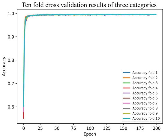 A single test result is not enough to ensure the superiority of our model because deep learning results differ with each training session. So, we further validated the performance of the proposed model with 10-fold cross-validation. The 10-fold cross-validation is an average split of all samples into 10 equal parts, any of which are considered test data, and it is used to obtain reliable and stable models. We also used fixed random seeds to determine the accuracy of the prediction algorithm by taking the average of 10 results. Figure 6 and Figure 7 show the results of the proposed model based on 10-fold cross-validation of test sets for three and four classification tasks. Ten-fold cross-validation of three and four classification tasks showed an average accuracy of 99.55% and 99.79%, respectively, for the proposed model.