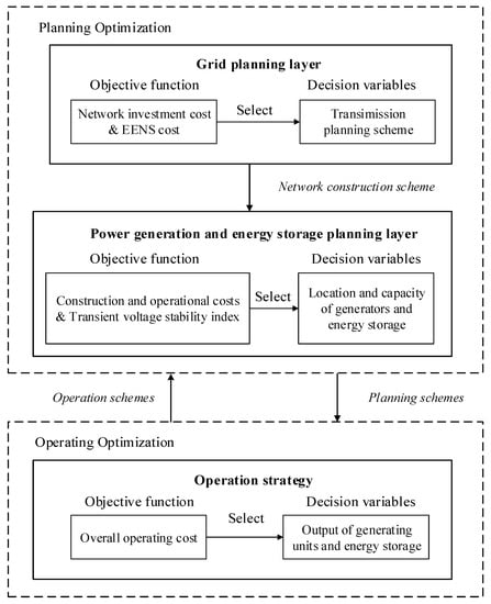 In summary, a significant amount of research has been performed on power generation and transmission system planning with a high proportion of renewable energy access. However, a planning method that considers both the adequacy of system regulation capacity and transient voltage stability must still be further investigated. In this paper, a planning method for a transmission and generation system that integrates reliability and transient voltage stability is proposed. A two-layer model of transmission and generation planning is established. Considering the cost of construction, the reliability criterion EENS, and the transient stability index, a multi-objective function is constructed. Based on the optimization of network construction in the upper layer, the sites, capacities and the operation cost of energy resources are optimized in the lower layer while restricting the influence of renewable energy on the system stability. A heuristic-based iterative algorithm is applied to solve the two-layer optimization problem. The results show that the comprehensive optimization objective of system planning is improved.