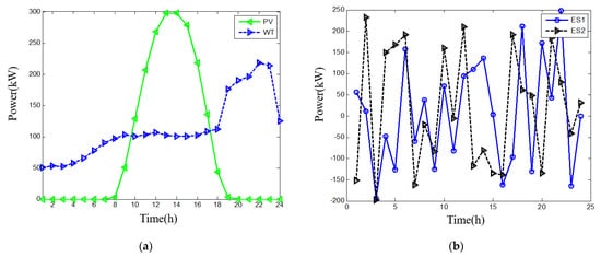 In Figure 3, the abscissa in the diagram is the time axis, corresponding to each moment of 24 h in a day. The ordinate represents the power value, and the unit is kW. As shown in Figure 3a, photovoltaic power reaches a high level during the day, while wind power experiences a peak at night. The outputs of new energy resources are effectively utilized to meet the power demand. Additionally, energy storage units are also optimized to contribute to the power supply, as depicted in Figure 3b. Two power curves depict the outputs of the energy storage devices that connected to node 12 and node 32, respectively. According to the operating parameters, the energy and power curves meet the constraints. Meanwhile, Figure 3c,d display the outputs of thermal power units and gas turbines, respectively, which are also adjusted to fit the power supply in the optimal planning scheme. The results indicate that the proposed planning model is effective in integrating various power sources and storage units to optimize the power supply and meet the demand in the system.