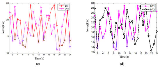Operation schemes of generators and energy storage systems: (a) outputs of new energy resources; (b) outputs of energy storage units; (c) outputs of thermal power units; (d) outputs of gas turbines.