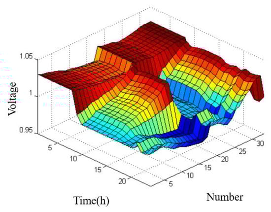 The results of power flow optimization are shown in the following figures. The x-axis coordinates in the figure correspond to each time of the day, and the y-axis coordinates correspond to the number of nodes in the system. The voltage profile in Figure 4 represents the voltage magnitude at each bus in the power system. The optimal voltage profile is kept within the acceptable range to ensure the stability and reliability of the system.