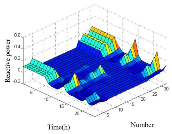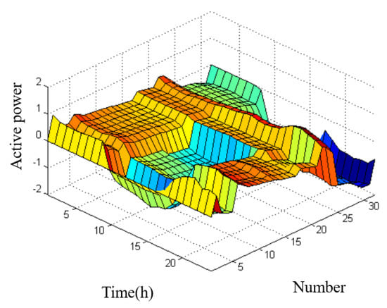 As depicted in Figure 5 and Figure 6, the optimal distribution of active and reactive power flows is able to ensure efficient power transfer and voltage stability. The corresponding z-axis coordinates represent the per-unit values of the active power and reactive power of each node on a single-day time scale, respectively. In terms of active power flow, the optimized system exhibited a balanced distribution of power among the different transmission lines and generators, resulting in a reduction in the overloading and underutilization of some of the system components.