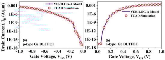 In general, complex simulations with a large number of transistors put the constraints of computational resources, a long simulation period and convergence issues in TCAD (ATLAS Device Simulation Software 4.2.0.R., 2015) [24]. To mitigate the above-mentioned issues, the Verilog-A models of p-type and n-type GE DLTFETs have been introduced. The device for the circuit-level simulation of both Ge DLTFETs has been followed here. The C–V and I–V characteristics of the above devices are obtained from the TCAD simulation tool by adjusting the bias conditions throughout a broad range of operating voltages. The lookup tables are prepared by using the extracted characteristics of both devices, including I–V and C–V data. For various performance parameters, i.e., drain current (IDS), gate-to-source capacitance (CGS) and gate-to-drain capacitance (CGD), as functions of (VGS, VDS) over a broad range of nominal voltage, the DC and small-signal simulations have been performed. The calibrated characteristics of p-type and n-type GE DLTFETs along with Verilog-A models and TCAD simulations results are verified. It has been observed that the developed Verilog-A models of p-type and n-type GE DLTFETs are favorably matched with the TCAD simulation results.