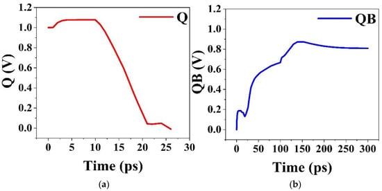 where is the amplitude of the current pulse. are the rising and falling time constants of the current pulse. For our analysis, I0 is taken to be 5 mA, and are taken to be 50 ps and 10 ps, respectively. Here, Q node is the impact node, so the current pulse is connected between node Q and the ground terminal. Let us say Q = 1 and QB = 0 and an ion strikes node Q at t = 0. The changes in the data stored at nodes Q and QB can be referred to as 1 to 0 upset at Q and 0 to 1 upset at QB. These effects are depicted in Figure 4. Therefore, SEU may cause a change in the state of an SRAM cell and, thus, degrades its performance. The transient voltage is observed at the above-described values of the I0, . For 1 to 0 upset at Q, due to the charge collected by the heavy ion attack, the voltage at the node of the drain of transistor X3 is discharged to less than 0 V. This effect is shown in Figure 4a. For 0 to 1 upset at QB, the heavy ion strike causes a voltage shift “1” to “0” at node Q, which switches on transistor X2 and turns off transistor X4. Hence, the data or value stored at the node changes from “0” to “1”. This effect is shown in Figure 4b. It can be concluded from the above figure that after applying an exponential current source model at the drain of X3, because of the radiation, the values at the storage node of DLTFET SRAM change. Hence the SRAM functionality is affected due to the introduction of radiation. The efficient working of the SRAM demands for this effect to be overcome. In this manuscript, a method has been suggested to mitigate the SEU effect at the transistor level itself.