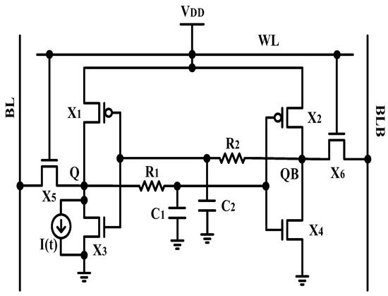 To mitigate the effect of SEU, in the 6T Ge-DLTFET SRAM cell, the radiation-hardening-by-design technique has been employed. This technique uses two RC feedback paths, connected between the two cross-coupled inverters. The circuit for the 6T DLTFET SRAM cell, employing the RHBD technique, is shown in Figure 5. Here, R1 and R2 are chosen to be 50 Ohms, and C1 and C2 are chosen to be 10 pF. It has been assumed that logic 1 is stored at node Q, whereas logic 0 is stored at node QB.