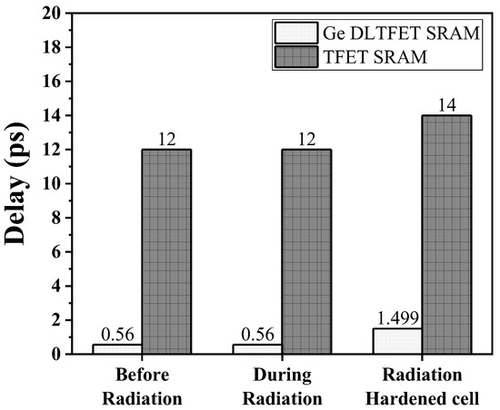 The delay analysis of 6T Ge DLTFET has been conducted using the SPICE tool for various cases, such as before the introduction of radiation, after the introduction of radiation and when delaying the radiation-hardened cell. The delay obtained for our circuit has been compared with that in [27] and is shown in Figure 7. It has been found that the delay of the hardened 6T SRAM cell is higher when compared to a conventional 6T SRAM cell. This is because of the additional RC feedback path, which increases the delay of the circuit. The delay in the DLTFET-based SRAM has been decreased by 95.33% and 89% in comparison with DGTFET-based SRAM. Thus, using DLTEFT improves the delay performance of the SRAM compared to that of DGTFET [28].