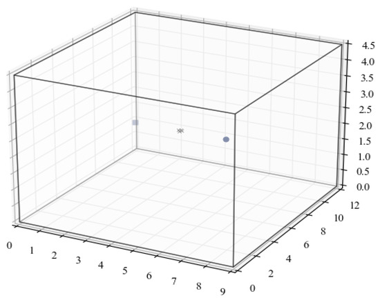 The three axes of the 3D matrix room in Figure 1 denote the length, width, and height of the room, respectively. Where × denotes the microphone array, the □ denotes the source signal, and ∘ denotes the interferer signal. The number of sources is set to , the source signal is selected from the CNU Arctic CORPUS speech database [30], and 5 additional interference sources are selected to generate diffuse noise. The number of microphones is , and the distance between adjacent microphones is 10 cm. All sound sources are located farther from the array than the critical distance of the room, which is the distance at which direct sound and reverberant energy are equal. This distance can be calculated by