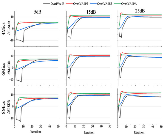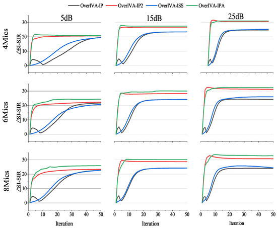 Figure 2 and Figure 3 show the separation performance of OverIVA-IP, OverIVA-IP2, OverIVA-ISS, and OverIVA-IPA. Where, Figure 2 uses △SI-SDR as the performance index, and Figure 3 uses △SI-SIR as the performance index. Through the analysis of various performance indicators, it can be seen that the proposed OverIVA-IPA method is superior to other methods in almost all experimental environments. Among them, in the 5 dB and 15 dB environments, the performance of the algorithm is superior. The proposed OverIVA-IPA algorithm is superior to other algorithms in performance, and it is the fastest algorithm to reach higher SI-SDR values and SI-SIR values, where the performance of the six microphones in Figure 2 is comparable to that of OverIVA-IP2 in the 15 dB environment. Table 1 shows that the response speed of OverIVA-IPA is the fastest, and quickly reaches a stable value of SI-SDR with the least number of iterations, and its computational efficiency is several times higher than other algorithms. Table 2 shows the stabilized SI-SDR values of the four methods. The results show that IPA is as effective as other methods in minimizing the cost function, performs better, and converges faster.