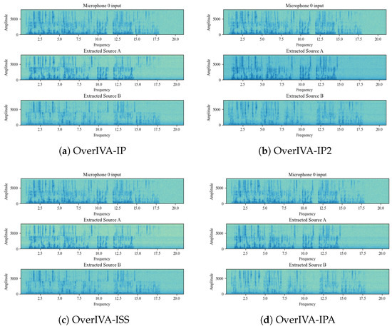 It can be seen from the separated spectrogram that the proposed OverIVA-IPA algorithm can separate the source signal from the mixed signal better than other algorithms, and the separated signal spectrogram waveform is better than other algorithms in detail.