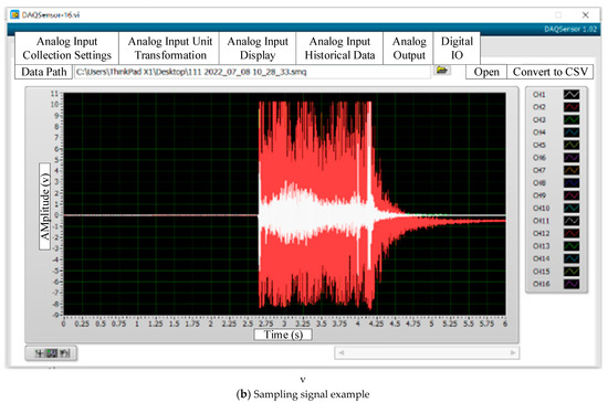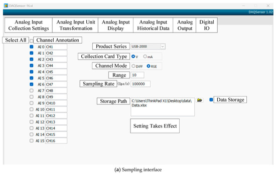 During the experiment in this study, the switching of the open/closed state of the switch was manually controlled by the experimenter on the control cabinet. In order to ensure that the vibration sensors could acquire the vibration signal during the course of the switch closing/opening operation, the sampling was set to start before each switch action and to stop about 2 s after each switch action. The steps for acquiring the vibration signal are as follows: