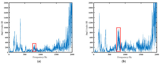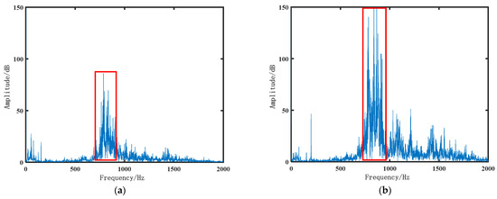 Taking vibration sensor 3 (393B12) as an example, Figure 5 and Figure 6 show the frequency spectra of the sensor output signals obtained without background noise and in the presence of thunderstorm noise, respectively. It can be seen that irrespective of whether the thunderstorm noise is added or not, there is a salient difference (e.g., the signals in red box) between the frequency domain information of the opening and closing states of the switch, which is conducive to the accurate detection of the two states.