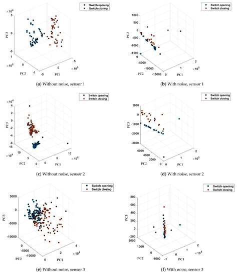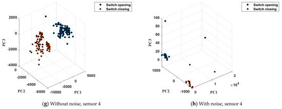 The data acquired in feature extraction normally have high dimensionality, which can reach thousands or even tens of thousands of dimensions, making it impossible to classify and identify features. Therefore, it is necessary to reduce the number of feature dimensions or the dimensions of the acquired data. We performed KPCA on the vibration signals obtained under all possible combinations of the GIS switch state, i.e., open and closed, and noise conditions, i.e., thunderstorm noise and no noise. Figure 7 shows the feature distributions of the four vibration sensors obtained from the KPCA analysis. The following observations can be made: